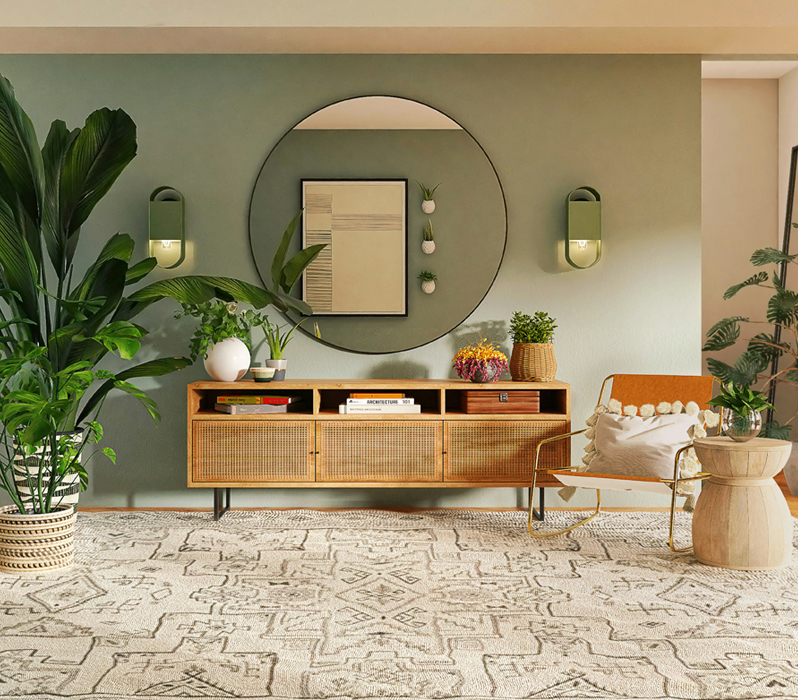 Retro-inspired with organic shapes, bold colors, and minimalist furniture.